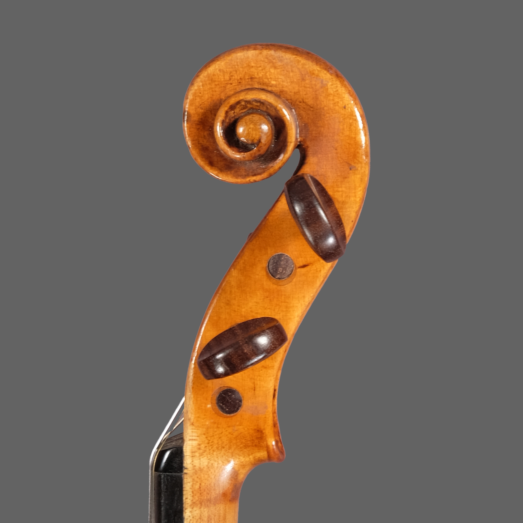 This is a particularly striking example of Carlo Antonio Testore’s work. It comes from an exciting period towards the end of his career when both Carlo Ferdinando Landolfi and Giovanni Baptista Guadagnini had arrived in Milan, with an inevitable competition and sharing of ideas. The violin is irrepressibly Testore work with very typical flat edgework, and a flattish middle to the arching. However, the instrument superficially strays towards a strong resemblance to Landolfi’s work especially in respect of sound holes that resemble the pattern that Landolfi adopted from about 1750. The shared whimsical flow to these is also found in some works of Guadagnini, though he maintained personal elements that make the similarities less overt. I have inserted a photograph below to show this violin compared to a Landolfi that I recently sold, illustrating the superficial likeness. Milanese violins tend to use relatively plain maple, but the one-piece back is spectacularly flamed and of the standard that one expects to see on Guadagnini’s violins during this period. The scroll, though to Testore’s outline shows unusual care in carving the volutes providing another indication that Testore was stepping up to the competition of his newly arrived colleagues in Milan. Most instruments by the Testore family have painted purfling which may at times be repurfled later. In this case it was purfled by the maker from new, and likewise the back of the scroll which would often be left uncarved is completed.